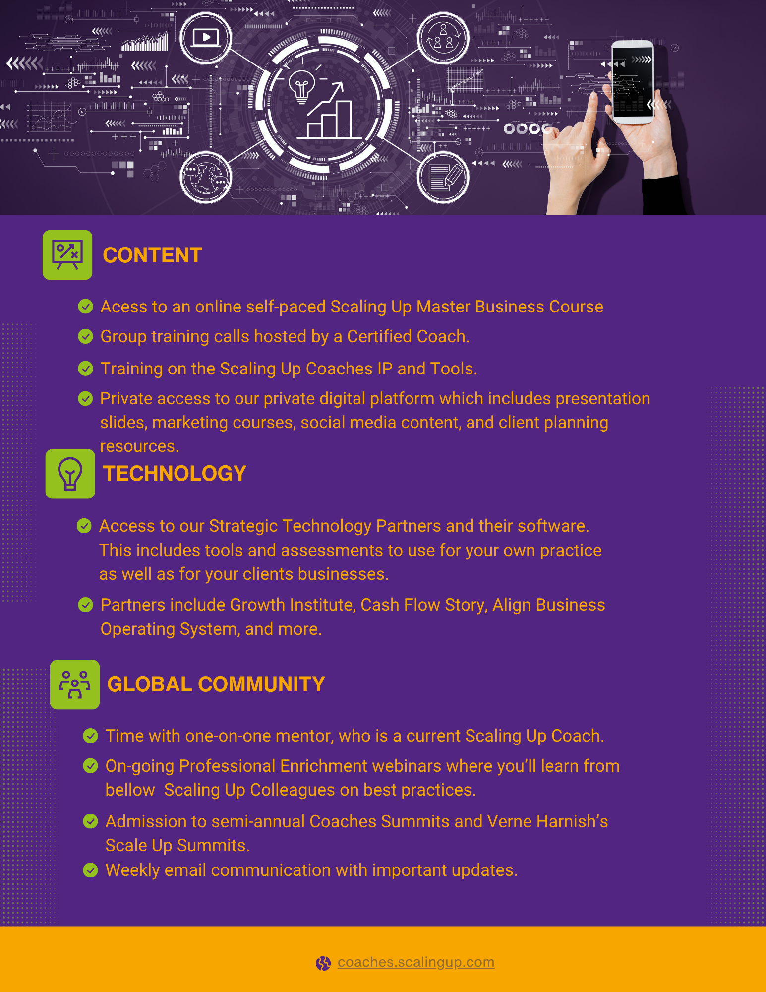 If you decide to become a Scaling Up Certified Coach™, our annual dues cover an extensive number of benefits and resources. You can read more about these benefits by clicking here.
