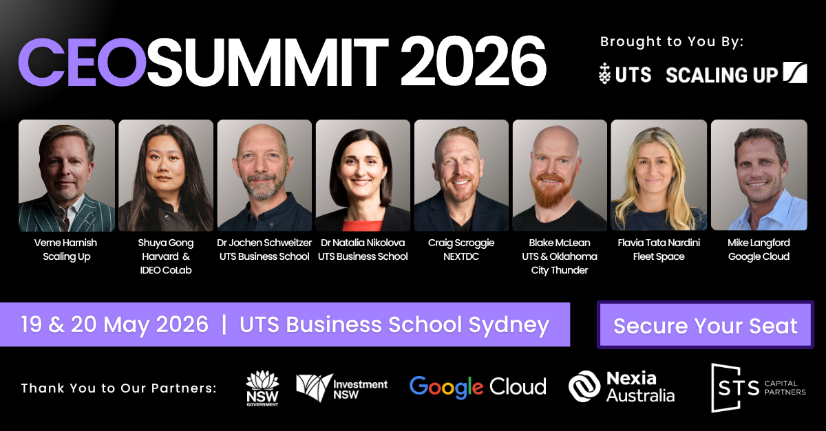 Hosted by Scaling Up in partnership with the University of Technology Sydney (UTS), the CEO Summit is designed for CEOs, founders and leaders navigating the challenges of scaling in an era of AI, rapid technological change and global competition. The 2026 theme, “Reimagining Scaling & Innovation,” will explore how owners and leaders can leverage leadership frameworks and management science to address constraints, uncertainty and forge new opportunities to build more valuable, scalable and resilient companies.